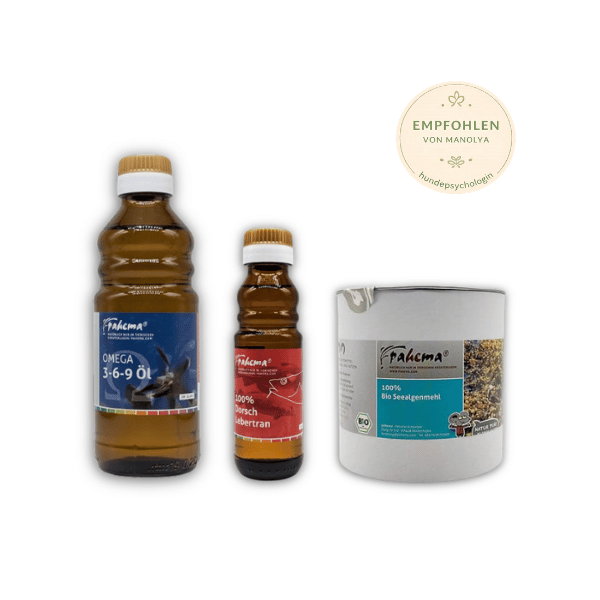 Bio Seealgenmehl, Dorsch-Lebertran und Omega 3-6-9 Öl. Drei Produkte, die in jedem BARF-Plan von Manolya empfohlen werden, jetzt als Set mit Sparvorteil.